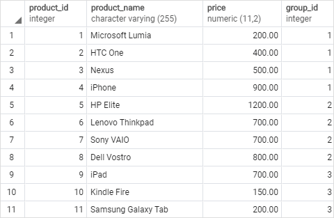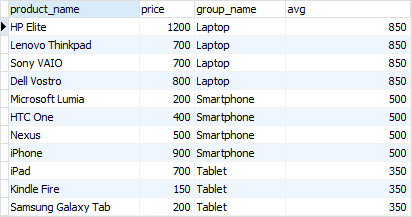 AVG(price) OVER (PARTITION BY group_name)In this syntax, the PARTITION BY distributes the rows of the result set into groups and the AVG() function is applied to each group to return the average price for each.
